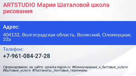 ARTSTUDIO Марии Шаталовой, школа рисования по адресу 404132, Волгоградская область, Волжский, Оломоуцкая, 22а в дальнейшем Организация, размещена в следующих категориях: