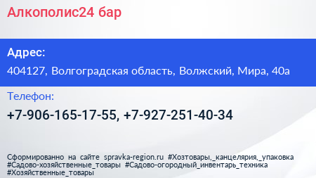 Алкополис24, бар по адресу 404127, Волгоградская область, Волжский, Мира, 40а в дальнейшем Организация, размещена в следующих категориях:
