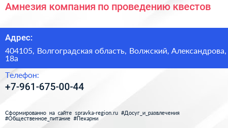 Амнезия, компания по проведению квестов по адресу 404105, Волгоградская область, Волжский, Александрова, 18а в дальнейшем Организация, размещена в следующих категориях: