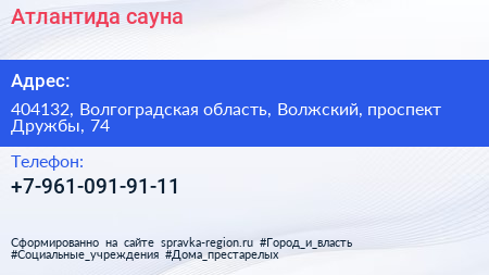 Атлантида, сауна по адресу 404132, Волгоградская область, Волжский, проспект Дружбы, 74 в дальнейшем Организация, размещена в следующих категориях: