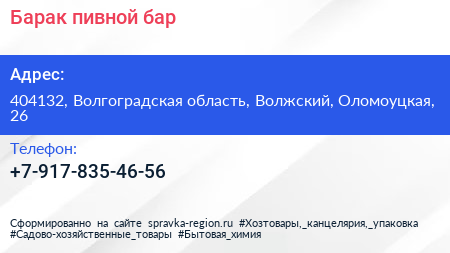Барак, пивной бар по адресу 404132, Волгоградская область, Волжский, Оломоуцкая, 26 в дальнейшем Организация, размещена в следующих категориях: