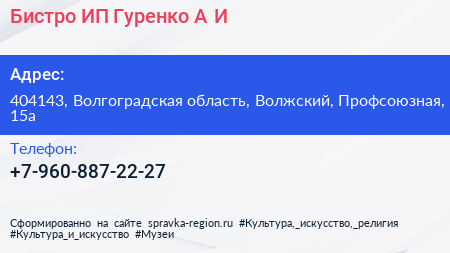 Бистро, ИП Гуренко А.И. по адресу 404143, Волгоградская область, Волжский, Профсоюзная, 15а в дальнейшем Организация, размещена в следующих категориях: