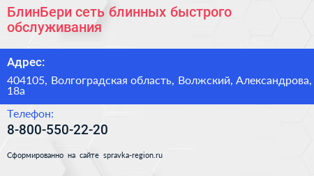 БлинБери, сеть блинных быстрого обслуживания по адресу 404105, Волгоградская область, Волжский, Александрова, 18а в дальнейшем Организация, размещена в следующих категориях: