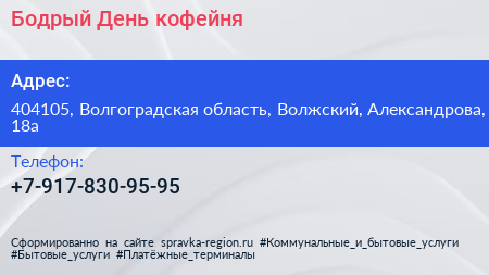 Бодрый День, кофейня по адресу 404105, Волгоградская область, Волжский, Александрова, 18а в дальнейшем Организация, размещена в следующих категориях: