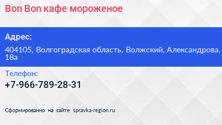 Bon-Bon, кафе-мороженое по адресу 404105, Волгоградская область, Волжский, Александрова, 18а в дальнейшем Организация, размещена в следующих категориях: