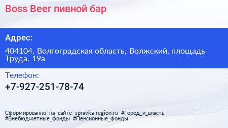 Boss Beer, пивной бар по адресу 404104, Волгоградская область, Волжский, площадь Труда, 19а в дальнейшем Организация, размещена в следующих категориях: