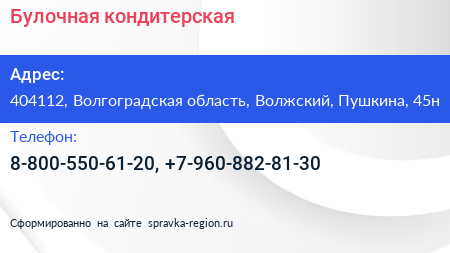 Булочная-кондитерская по адресу 404112, Волгоградская область, Волжский, Пушкина, 45н в дальнейшем Организация, размещена в следующих категориях: