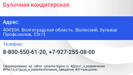 Булочная-кондитерская по адресу 404104, Волгоградская область, Волжский, бульвар Профсоюзов, 13г/1 в дальнейшем Организация, размещена в следующих категориях: