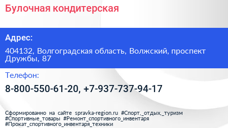 Булочная-кондитерская по адресу 404132, Волгоградская область, Волжский, проспект Дружбы, 87 в дальнейшем Организация, размещена в следующих категориях: