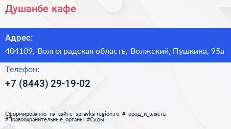 Душанбе, кафе по адресу 404109, Волгоградская область, Волжский, Пушкина, 95а в дальнейшем Организация, размещена в следующих категориях: