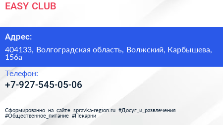 EASY CLUB по адресу 404133, Волгоградская область, Волжский, Карбышева, 156а в дальнейшем Организация, размещена в следующих категориях: