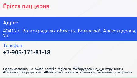 Ёpizza, пиццерия по адресу 404127, Волгоградская область, Волжский, Александрова, 9а в дальнейшем Организация, размещена в следующих категориях: