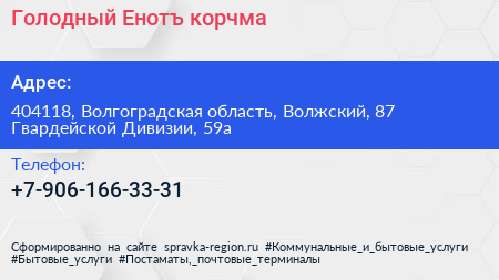 Голодный Енотъ, корчма по адресу 404118, Волгоградская область, Волжский, 87 Гвардейской Дивизии, 59а в дальнейшем Организация, размещена в следующих категориях: