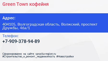 Green Town, кофейня по адресу 404105, Волгоградская область, Волжский, проспект Дружбы, 46а/1 в дальнейшем Организация, размещена в следующих категориях: