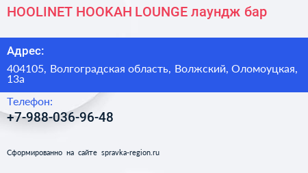 HOOLINET HOOKAH LOUNGE, лаундж-бар по адресу 404105, Волгоградская область, Волжский, Оломоуцкая, 13а в дальнейшем Организация, размещена в следующих категориях: