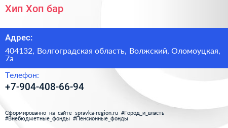 Хип-Хоп, бар по адресу 404132, Волгоградская область, Волжский, Оломоуцкая, 7а в дальнейшем Организация, размещена в следующих категориях: