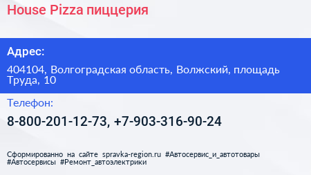 House Pizza, пиццерия по адресу 404104, Волгоградская область, Волжский, площадь Труда, 10 в дальнейшем Организация, размещена в следующих категориях:
