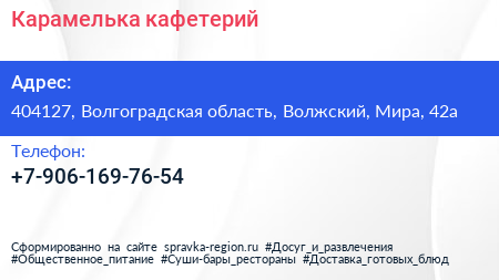Карамелька, кафетерий по адресу 404127, Волгоградская область, Волжский, Мира, 42а в дальнейшем Организация, размещена в следующих категориях: