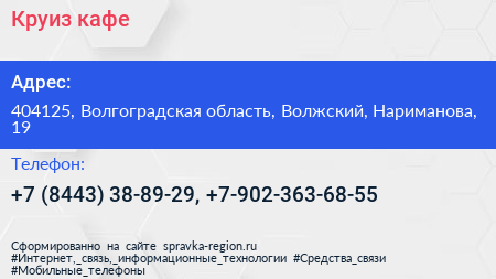 Круиз, кафе по адресу 404125, Волгоградская область, Волжский, Нариманова, 19 в дальнейшем Организация, размещена в следующих категориях: