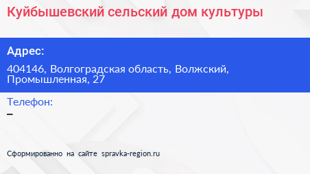 Куйбышевский сельский дом культуры по адресу 404146, Волгоградская область, Волжский, Промышленная, 27 в дальнейшем Организация, размещена в следующих категориях: