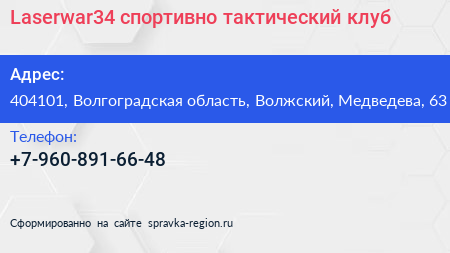 Laserwar34, спортивно-тактический клуб по адресу 404101, Волгоградская область, Волжский, Медведева, 63 в дальнейшем Организация, размещена в следующих категориях: