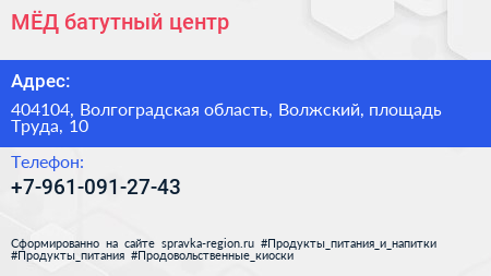 МЁД, батутный центр по адресу 404104, Волгоградская область, Волжский, площадь Труда, 10 в дальнейшем Организация, размещена в следующих категориях:
