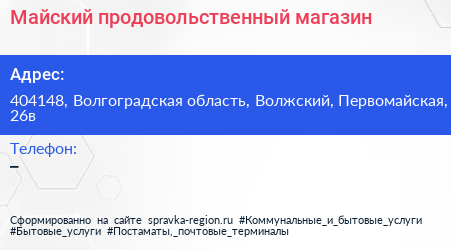 Майский, продовольственный магазин по адресу 404148, Волгоградская область, Волжский, Первомайская, 26в в дальнейшем Организация, размещена в следующих категориях: