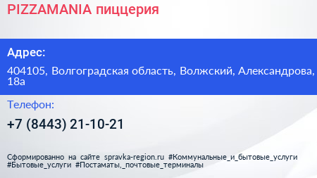 PIZZAMANIA, пиццерия по адресу 404105, Волгоградская область, Волжский, Александрова, 18а в дальнейшем Организация, размещена в следующих категориях: