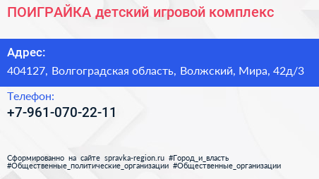 ПОИГРАЙКА, детский игровой комплекс по адресу 404127, Волгоградская область, Волжский, Мира, 42д/3 в дальнейшем Организация, размещена в следующих категориях: