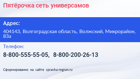 Пятёрочка, сеть универсамов по адресу 404143, Волгоградская область, Волжский, Микрорайон, 83а в дальнейшем Организация, размещена в следующих категориях: