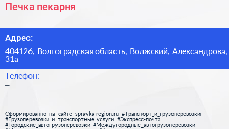 Печка, пекарня по адресу 404126, Волгоградская область, Волжский, Александрова, 31а в дальнейшем Организация, размещена в следующих категориях: