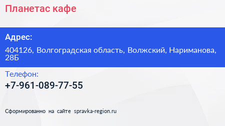 Планетас, кафе по адресу 404126, Волгоградская область, Волжский, Нариманова, 28Б в дальнейшем Организация, размещена в следующих категориях: