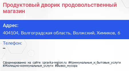 Продуктовый дворик, продовольственный магазин по адресу 404104, Волгоградская область, Волжский, Химиков, 6 в дальнейшем Организация, размещена в следующих категориях: