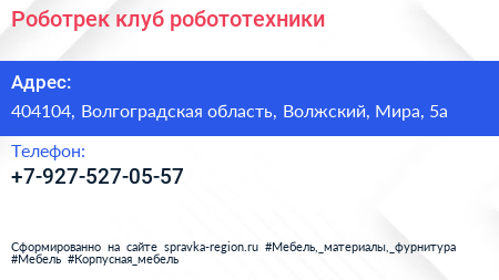 Роботрек, клуб робототехники по адресу 404104, Волгоградская область, Волжский, Мира, 5а в дальнейшем Организация, размещена в следующих категориях: