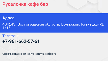 Русалочка, кафе-бар по адресу 404143, Волгоградская область, Волжский, Кузнецкая-1, 1/15 в дальнейшем Организация, размещена в следующих категориях: