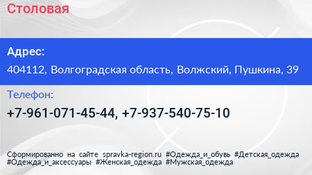 Столовая по адресу 404112, Волгоградская область, Волжский, Пушкина, 39 в дальнейшем Организация, размещена в следующих категориях: