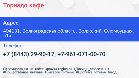 Торнадо, кафе по адресу 404131, Волгоградская область, Волжский, Оломоуцкая, 51а в дальнейшем Организация, размещена в следующих категориях: