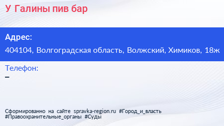 У Галины, пив-бар по адресу 404104, Волгоградская область, Волжский, Химиков, 18ж в дальнейшем Организация, размещена в следующих категориях: