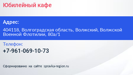 Юбилейный, кафе по адресу 404118, Волгоградская область, Волжский, Волжской Военной Флотилии, 80а/1 в дальнейшем Организация, размещена в следующих категориях: