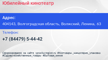 Юбилейный, кинотеатр по адресу 404143, Волгоградская область, Волжский, Ленина, 63 в дальнейшем Организация, размещена в следующих категориях: