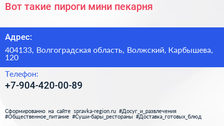 Вот такие пироги, мини-пекарня по адресу 404133, Волгоградская область, Волжский, Карбышева, 120 в дальнейшем Организация, размещена в следующих категориях:
