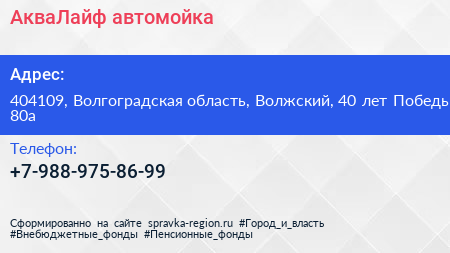 АкваЛайф, автомойка по адресу 404109, Волгоградская область, Волжский, 40 лет Победы, 80а в дальнейшем Организация, размещена в следующих категориях: