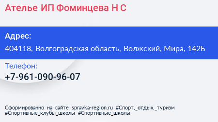 Ателье, ИП Фоминцева Н.С. по адресу 404118, Волгоградская область, Волжский, Мира, 142Б в дальнейшем Организация, размещена в следующих категориях: