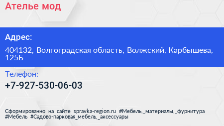 Ателье мод по адресу 404132, Волгоградская область, Волжский, Карбышева, 125Б в дальнейшем Организация, размещена в следующих категориях: