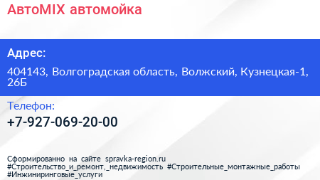 АвтоMIX, автомойка по адресу 404143, Волгоградская область, Волжский, Кузнецкая-1, 26Б в дальнейшем Организация, размещена в следующих категориях: