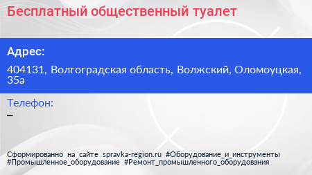 Бесплатный общественный туалет по адресу 404131, Волгоградская область, Волжский, Оломоуцкая, 35а в дальнейшем Организация, размещена в следующих категориях: