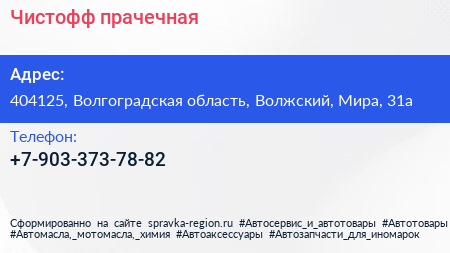 Чистофф, прачечная по адресу 404125, Волгоградская область, Волжский, Мира, 31а в дальнейшем Организация, размещена в следующих категориях: