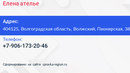 Елена, ателье по адресу 404125, Волгоградская область, Волжский, Пионерская, 38 в дальнейшем Организация, размещена в следующих категориях: