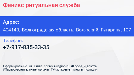 Феникс, ритуальная служба по адресу 404143, Волгоградская область, Волжский, Гагарина, 107 в дальнейшем Организация, размещена в следующих категориях: