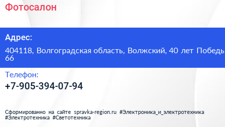 Фотосалон по адресу 404118, Волгоградская область, Волжский, 40 лет Победы, 66 в дальнейшем Организация, размещена в следующих категориях: